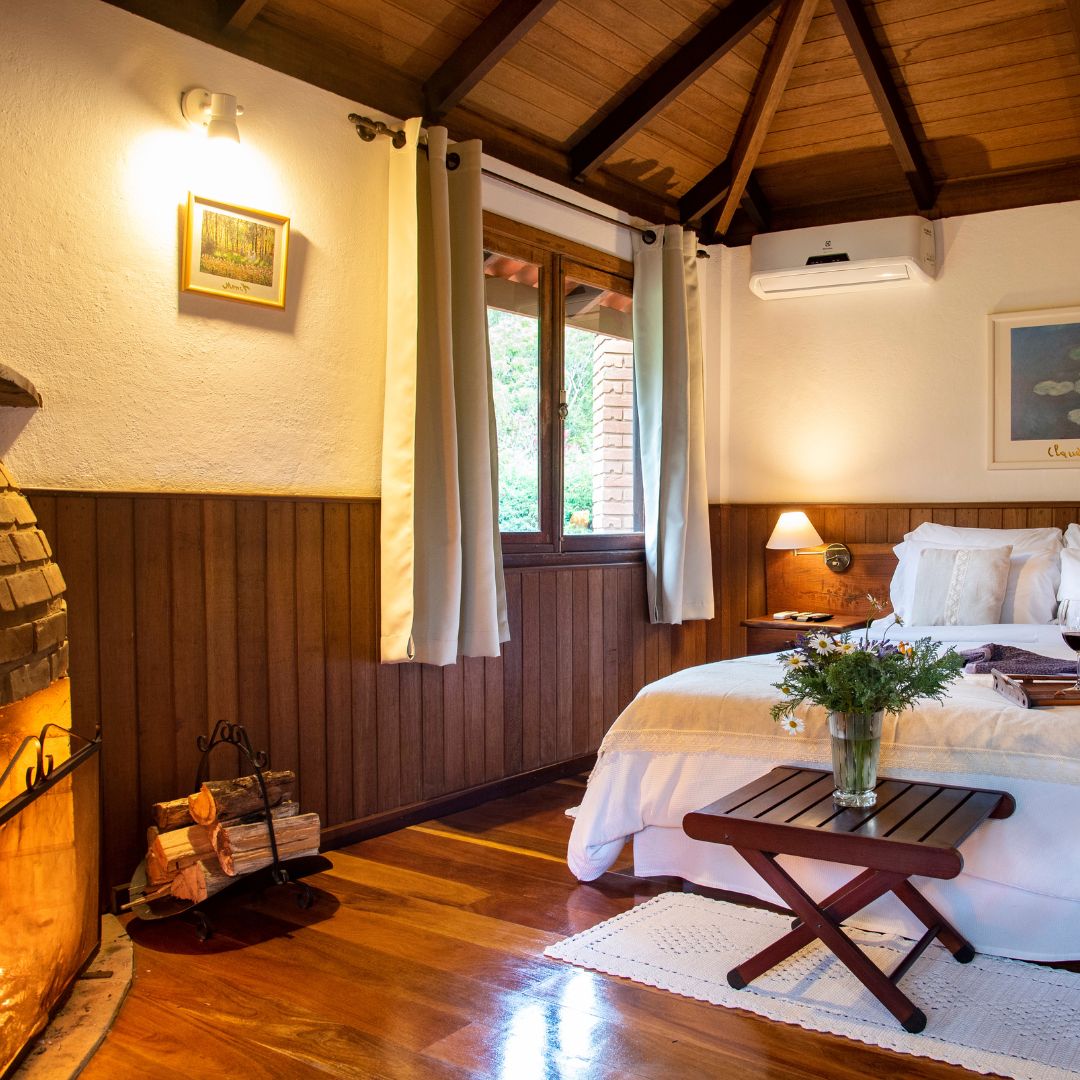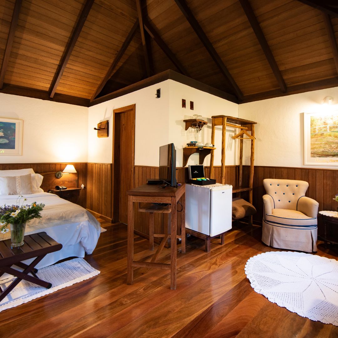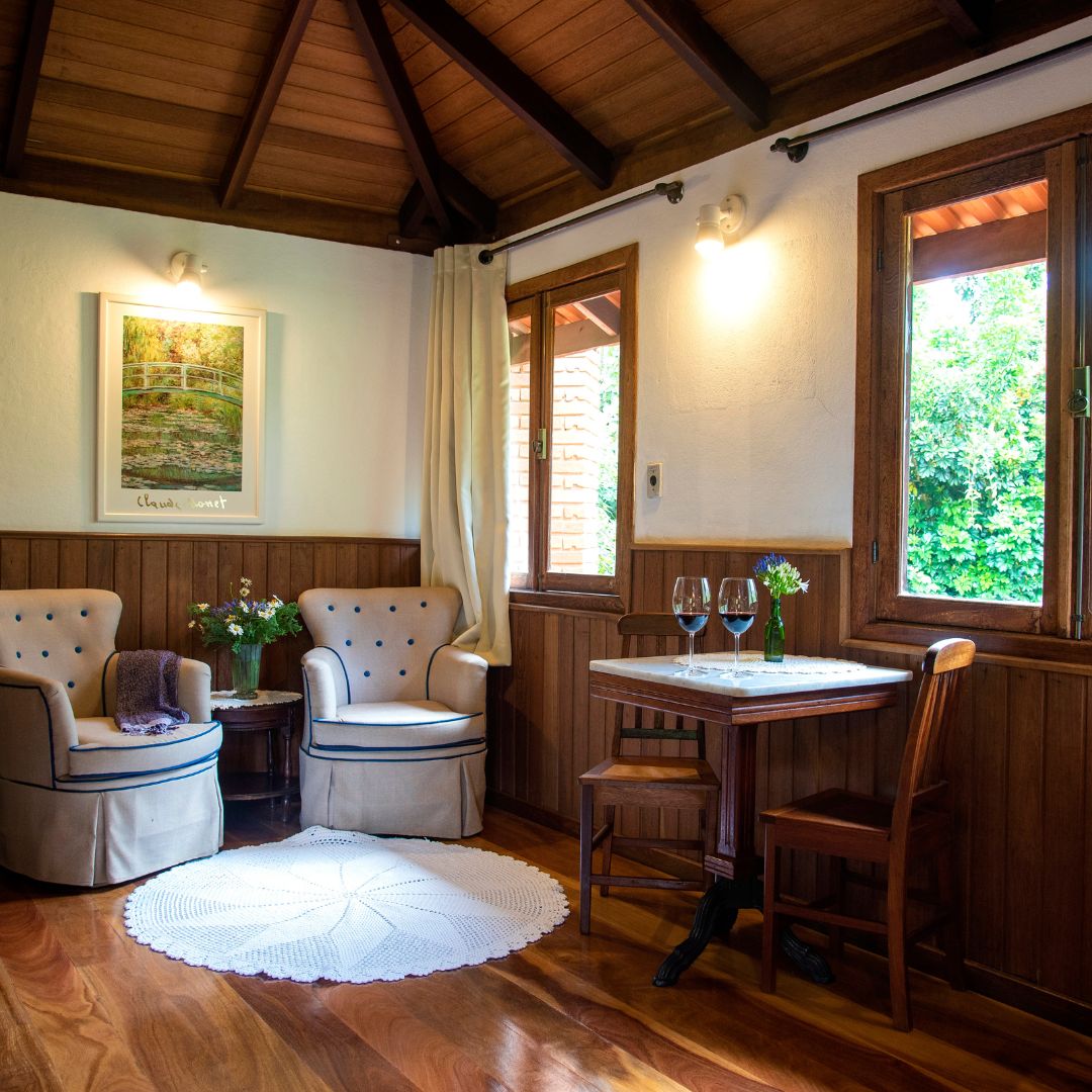 O  Apartamento Monet é um ‘loft’, onde quarto, ambiente de estar, hidromassagem e mesinha com cadeiras constituem um só ambiente, formado a partir da lareira (central). Batizamos a unidade como o nome de um dos impressionistas que retratava em suas telas os reflexos e efeitos que a luz do sol produz nas cores da natureza. A presença dos contrastes, transparências luminosas, sugestão de felicidade e de vida harmoniosa transparecem nas imagens criadas pelos impressionistas. Daí o nome dessa Unidade. Os janelões propiciam aos hóspedes um visual para nossos jardins, que são fonte de inspiração e interação com a natureza.